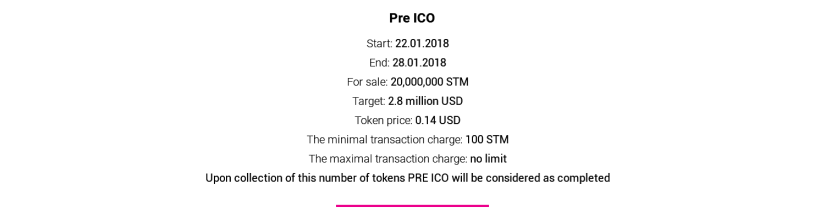 Start exchange rate. The cost of one token is determined at the level of 0.2 US dollars for a token. Tokens will be distributed in proportion to the amount contributed by investors during the ICO subject to the premium being due to them. The price of 1STM in ETH will be fixed an hour before PRE-ICO/ICO according to the currency rate of Poloniex exchange market, ETH — USD exchange rates will be updated every hour.