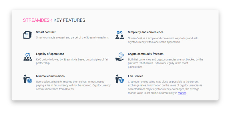 Users will appreciate the minimal commissions, which may not even include any fees and fiat currency. The cryptocurrency commissions can be as small as zero and max out at 2 percent, letting users save money. For further savings, StreamDesk offers a fair service with the cryptocurrency value set as close to the current exchange rate as possible. In fact, the system automatically sets the average market value based on information from major exchanges.