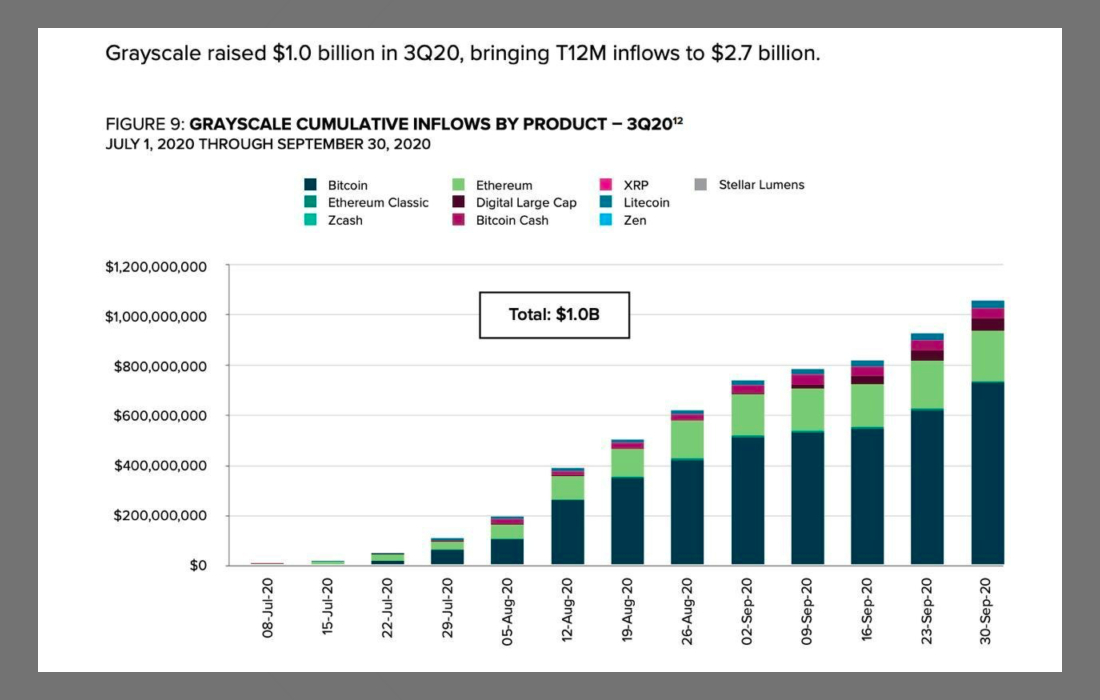 Grayscale's new report says that in the third quarter of 2020, the inflow of investments into crypto reached a record $1.05 billion, and the total number of assets under Grayscale Investment's management is $6.3 billion.