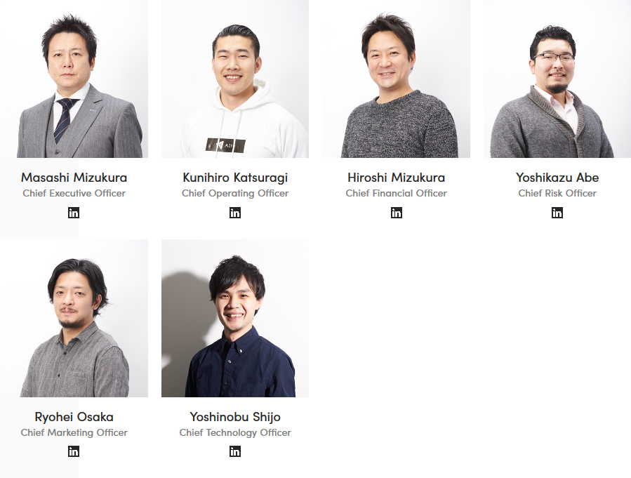 Others are BOARD DIRECTOR AND COO (CHIEF OPERATING OFFICER), Kunihiro Katsuragi, BOARD DIRECTOR AND CFO (CHIEF FINANCIAL OFFICER), Hiroshi Mizukura, BOARD DIRECTOR AND CRO (CHIEF RISK OFFICER) Yoshikazu Abe, BOARD DIRECTOR AND CMO (CHIEF MARKETING OFFICER) Ryohei Osaka, BOARD DIRECTOR AND CTO (CHIEF TECHNOLOGY OFFICER) Yoshinobu Shijo, EXECUTIVE OFFICER AND CCO (CHIEF CREATIVE OFFICER) Kenta Sugihara. Others are; EXECUTIVE OFFICER AND CSO (CHIEF STRATEGY OFFICER)*Masahiko Tamamura, EXECUTIVE OFFICER AND CAO (CHIEF ADMINISTRATIVE OFFICER) Miho Takahashi, DEVELOPMENT MANAGER, Mathias Glintborg