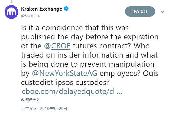 实际上,临近交割,波动加大,已经是交易员的共识。因为快要到达合约交割日期的时候,参与期货交易的多空双方为了争取到对自己有利的合约交割价,会在最后一刻通过释放利己消息、使用强大资金实力迫使对手盘巨亏等等手段对期货乃至现货价格施加影响,让自己盈利。说到这里值得一提的是,去年九月加密货币交易所Kraken曾在推特上质疑美国纽约州总检察长办公室,称其在Cboe期货合约结算前发布《虚拟市场诚信活动报告》,存在内幕交易的嫌疑。