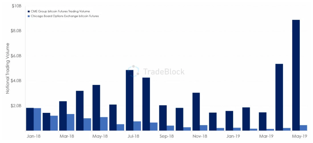 回到最近关于Cobe停止比特币期货的讨论,我们很容易能找到原因。相较于CME与BitMEX,Cboe的比特币期货交易量占比实在太小。根据TradeBlock的数据显示,从去年开始Cboe的比特币期货交易量持续锐减;最近几个月甚至屡创新低。所以说,Reddit和推特上很多人认为,Cboe期货如此小的交易规模,即使下线了也不会对市场成交量乃至比特币价格产生多大影响;那么其结算日带来的市场反应就更不用说了。