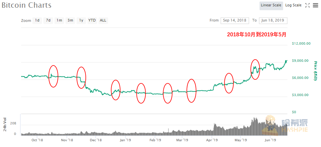 红色圈地方为,从去年1月到今年5月Cboe比特币期货合约的交割时间点(截图源自:Coinmarketcap)