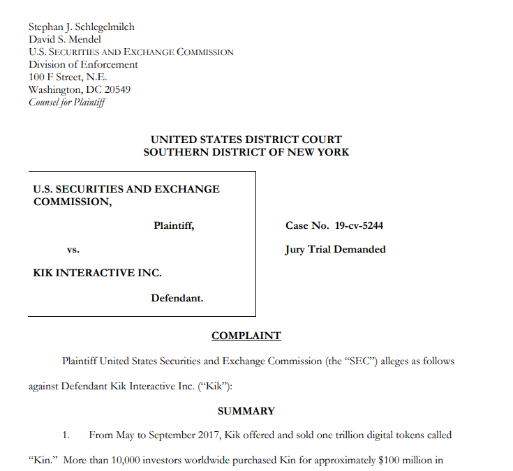 不过更为重要的是,Kik没有足够的精力以及财力与SEC战斗到底。通常情况下,这类诉讼具有五年有效诉讼期;也就是说接下来SEC将有大把时间搜集证据证明Kik的代币发行属于证券发行。而且值得一提的是,独立法律研究员Katherine Wu在给诉讼书写批注的时候表示,撰写诉状的Stephan Schlegelmilch和David Mendel为该部门的高级诉讼律师,可见SEC对此次事件的重视程度颇高。
