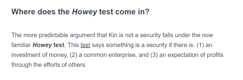 · 承诺盈利,激励投资:为此2017年中旬,Kik CEO将其代币Kin作为投资机会在多个场合进行营销,并承诺随着需求的增加将推高Kin的价值;同时该公司还在社交媒体多次透露已与部分交易所谈妥,Kin发行后会立即在二级市场交易……而在SEC看来,这种基于他人努力的未来利润就是证券发行的标志。
