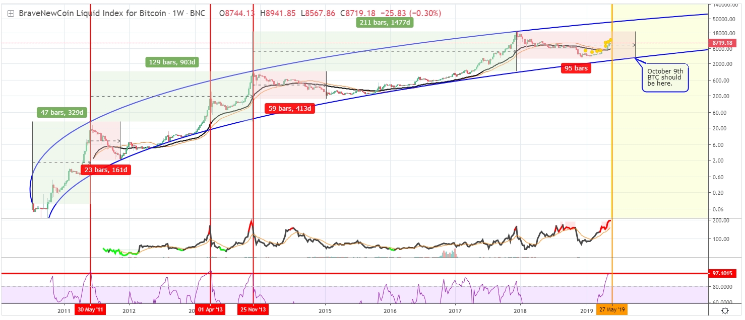 지난 번 분석글에서 비트코인이 아직 저의 상승 로그 아치(파란색 선)의 바닥을 치지 않았다는 것에 대해 자세히 설명을 했는데요, 저는 올해 말엔 도달할 것으로 봅니다. 제가 계산한 가장 유력한 날짜는 10월 9일로 가격은 3000불 대로 예상해 봅니다. 만약 그렇게 된다면, 비트코인이 상승 로그 아치 채널 안에서의 움직인다는 사실을 보여줄 뿐만 아니라 현재 많은 사람들이 망각하거나 무시하거나 혹은 이해하지 못하고 있는 비트코인의 선형적 본질 (linear nature) 또한 증명하게 됩니다.