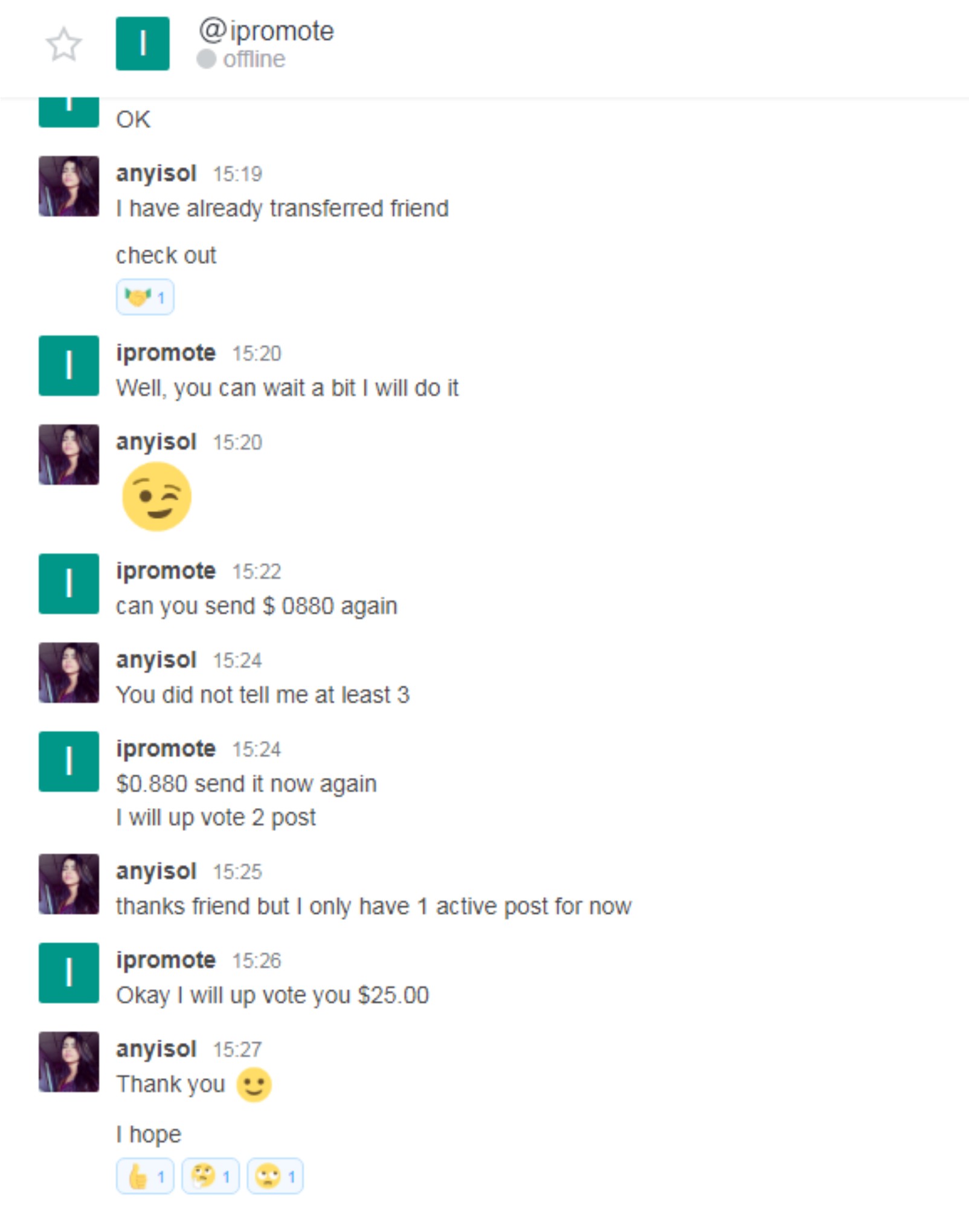 Ahh, you got scammed on steem.chat. That is not me. If you get private messaged on Steem.chat asking for SBD for delegation or a vote, 99.99% of the time it is a scam.