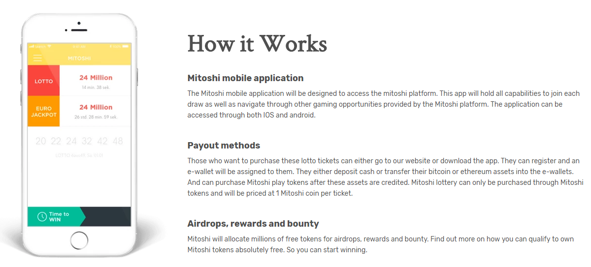 Mitoshi will have a large lottery line. Each lottery contains a large payment for the winners. Mitoshi CryptoLotto will have a global reach, allowing anyone from all over the world to participate with the tap of a finger.