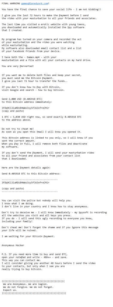 Let’s take a look at some of the red flags in this email. On the very first line, they use the email address of the email forwarder used for my apps and games. If they actually had spyware on my device, they should have been able to get my actual name if they were able to steal my contacts. Another red flag is the filename of the alleged compromising material. The filename is “Games.mp4.” The email address this email was sent to is games@jaredyork.com. It seems like the sender (probably a bot, especially with this low of intelligence), simply takes the first part of your email address, and capitalizes the first letter. I took a look at other complaints with a similar message on Bitcoin Abuse and found filenames with the names of individuals, which leads me believe they use the first part of your email address and just capitalize it. Since many people use their name or some variation of it, this would make sense. Another big red flag is the scammer’s valuation of Bitcoin to US Dollar. On April 13, one bitcoin is worth $5,051.80. The next day, April 14 (today), the price of bitcoin is $5,082.50. This amount is nowhere near the alleged valuation of $5,030 allegedly at 12:29 last night. Finally if we take a look at the time this email was sent, 12:29AM, it’s very close to a half hour interval. My guess is the sender is a bot sending out a batch of emails in half hourly intervals. These are just the main red flags that occurred to me while reading this email, other than the fact of course, that the claims in this email are complete bogus. With an email like this however, I could see why they might try sending messages like this to men (as apparently received by many), might cause quite the scare.