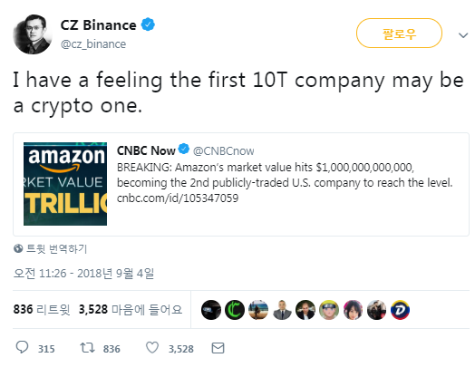 오늘 애플에 이어 아마존의 시가 총액이 1조 달러가 넘어선 것과 관련해 자오장펑 바이낸스 창업자가 트위터를 통해 "다음 시가총액 1조원 넘을 기업은 암호화폐 기업일 수 있다"고 말했다.