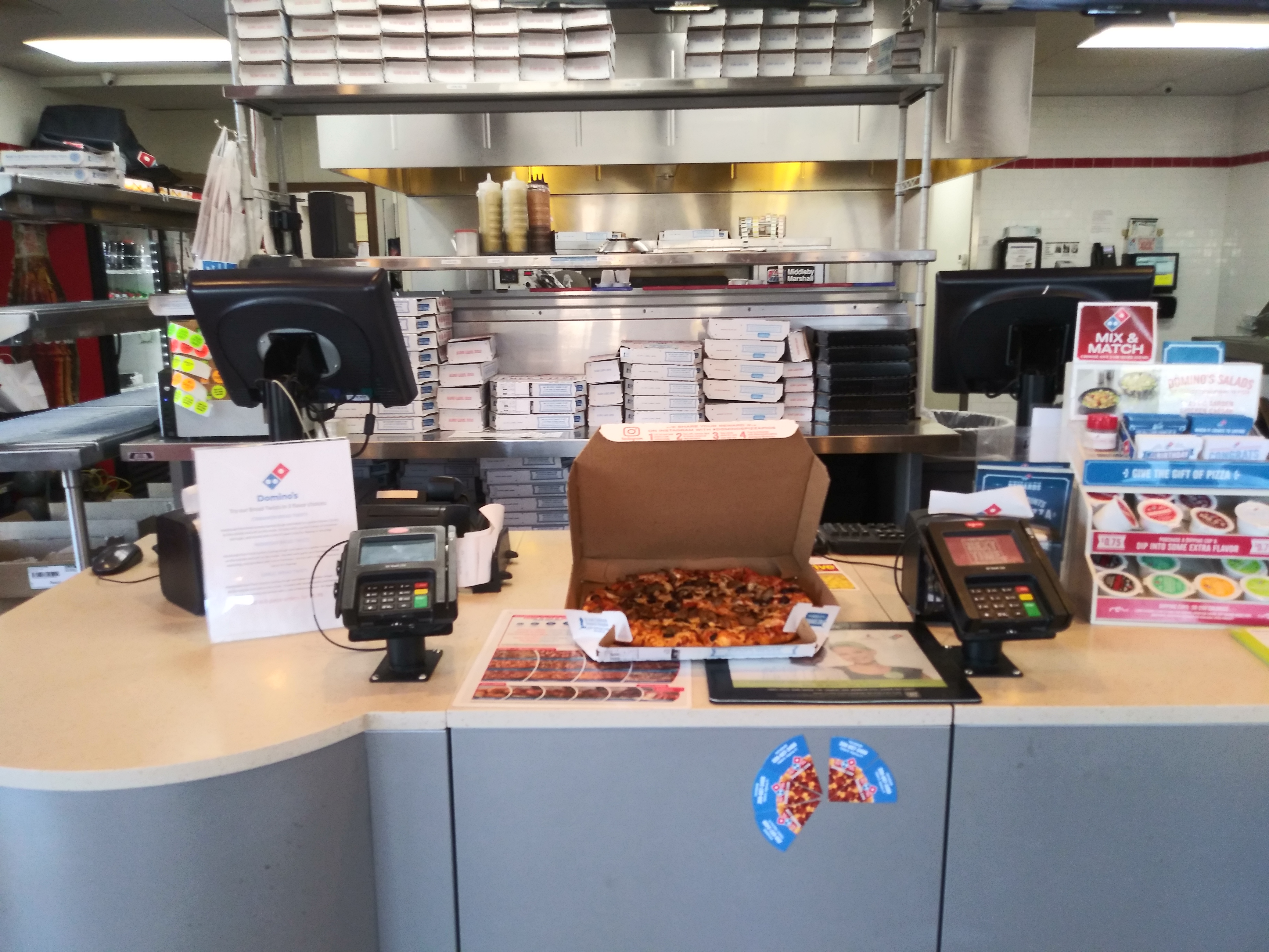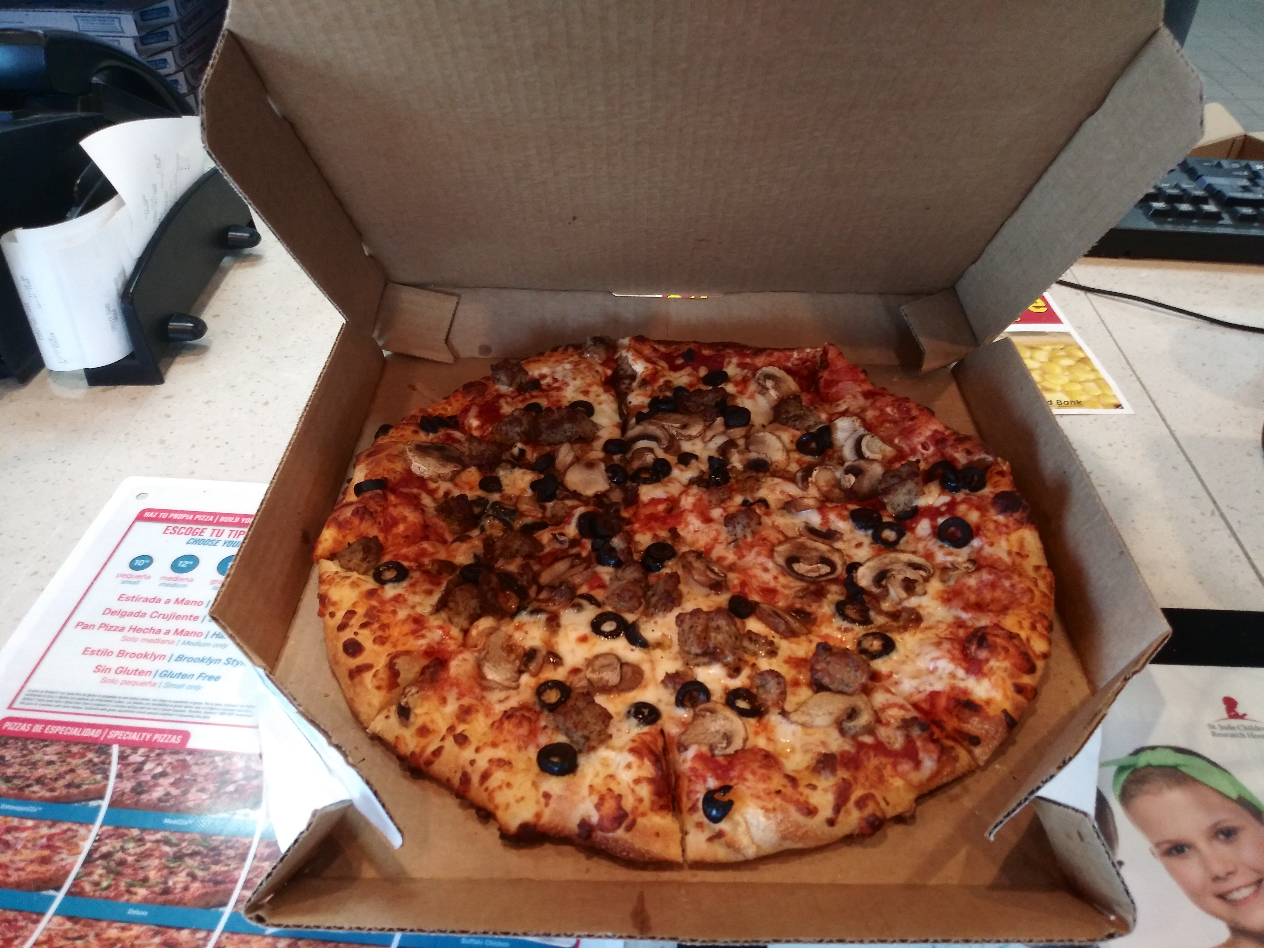 Here is what 117,000 Satoshis bought me. It is a large three topping pizza from dominoes. Mushrooms, olives and sausages. It was so good though. I used a coupon