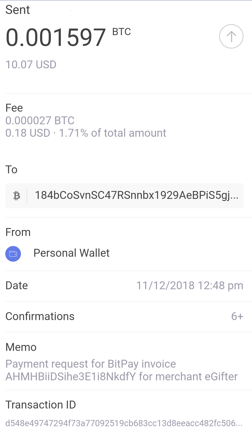 This process was very frustrating I was so hungry though, I just kept fighting on. I tried to send Bitcoin from coinomi but for some reason it kept giving me a web address instead of a crypto address to send my bitcoin and that wasnt going to work. I then discovered I have to download a bitpay wallet and send my crypto there, then pay from my bitpay wallet. I must say though Bitpay wallet is a very secure wallet and it impressed me by the high security measures. Here are the transactions from my coinomi wallet to the bitpay wallet and from the bitpay wallet to egifter