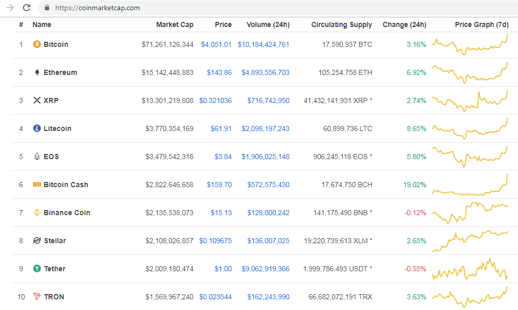 Crypto market is continuously increasing. Are we expecting another bull run soon? There is a $5B USD increase in market cap today from $135B USD yesterday it is now Market Cap: $140,706,353,352 • 24h Vol: $33,589,534,776 • BTC Dominance: 50.6%. Keeping my fingers cross! We can also see that the price of Bitcoin increased by $100 USD today from $3900 USD yesterday I am happy to see that it is now $4000 USD.