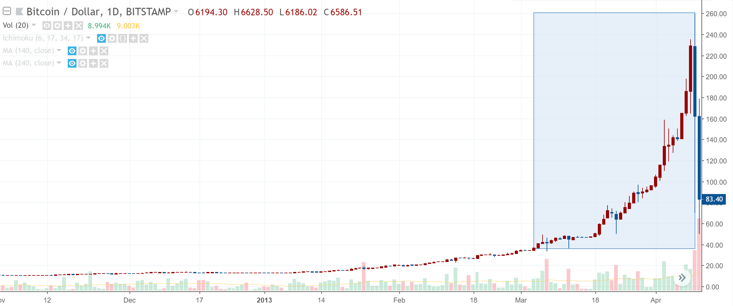 (2013년 3월 40$ -> 2013년 11월 260$. 약 6.5배 폭등)