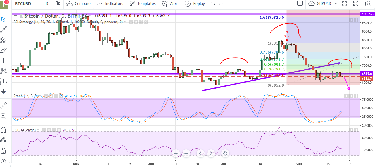 Bitcoin was ever so slighty in an uptrend as indicated by the diagonal trend line by which the left shoulder and head were formed and we are now seeing the right shoulder forming. From this, price could possibly drop initially to $5,800 being the neckline. As usual only time will tell how the world of bitcoin and its shenanigans plays out.