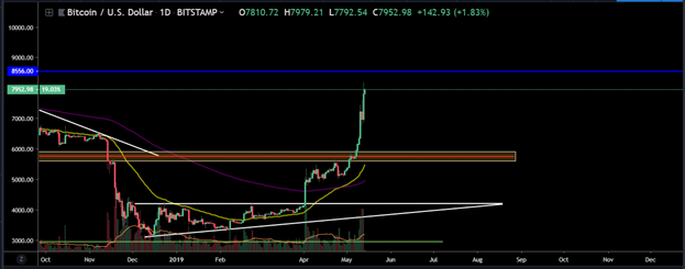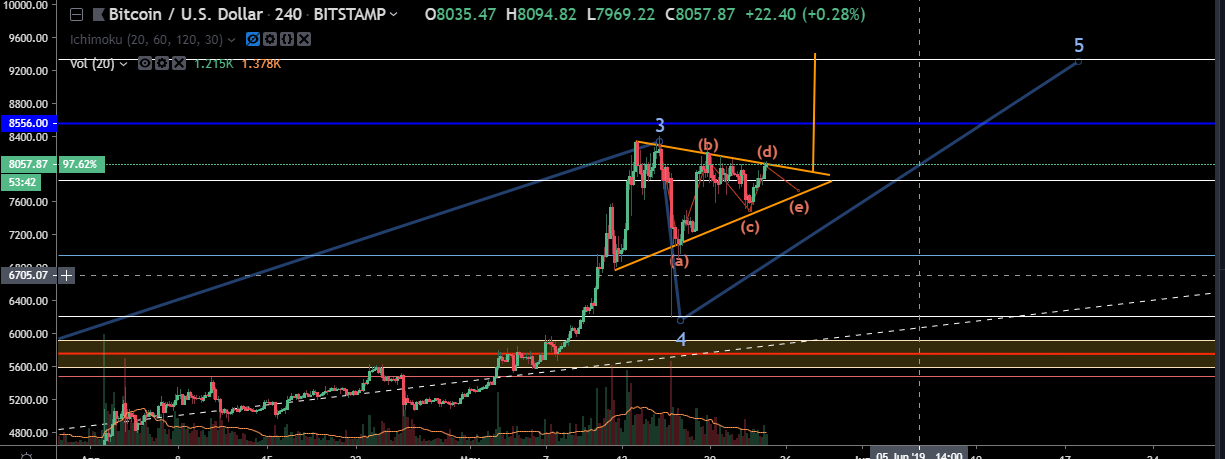 El precio de BTC se ha mantenido consolidando por debajo de la resistencia de $8.556, desarrollando una figura que se puede interpretar como de continuación, denominada "Triangulo Simetrico" lo cual brinda una mayor probabilidad de que la ruptura de dicho triangulo sea alcista, dado a que esta proviene desde un rally alcista que inicio el dia 2 de abril de 2019