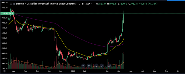 Ya muchas condiciones sugieren que el mercado bajista llego a su fin, a pesar de que según análisis previos, basándome en el comportamiento del mercado bajista anterior, considere que esta fase de indiferencia se prolongaría durante 2019 como ocurrio en 2015 y que la corrida alcista ocurría como consecuencia del halving. La primera condición es que en el grafico diario se produjo un cruce entre la media móvil exponencial de 50 periodos con la de 200 (la media más rápida se situo por encima de la más lenta) y el precio pudo mantenerse por encima de ambos promedios, un hecho que no ocurrió durante el transcurso de todo el mercado bajista de 2018. A este cruce se le conoce como “el cruce dorado” y esta fue la primera señal que marco fin al mercado bajista de 2014- 2015.