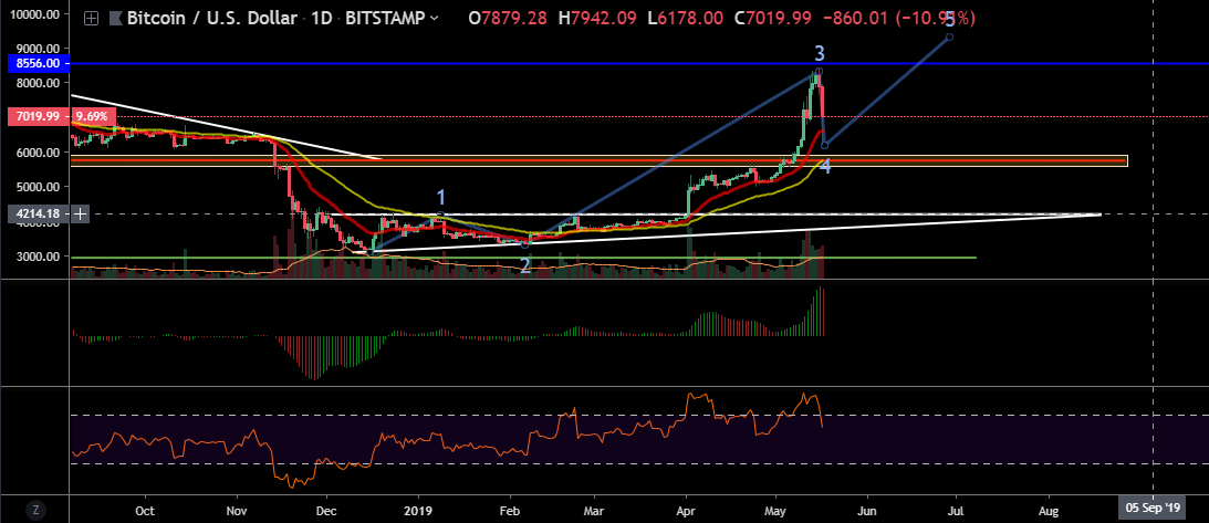 Bitcoin al impactar por primera vez con esa zona de resistencia señalada por la línea horizontal roja, tuvo un retroceso leve y posteriormente continuo con su carrera alcista hacia los $8.000 invalidando las divergencias bajistas que estaban en los osciladores y el conteo de Eliott que habia propuesto.