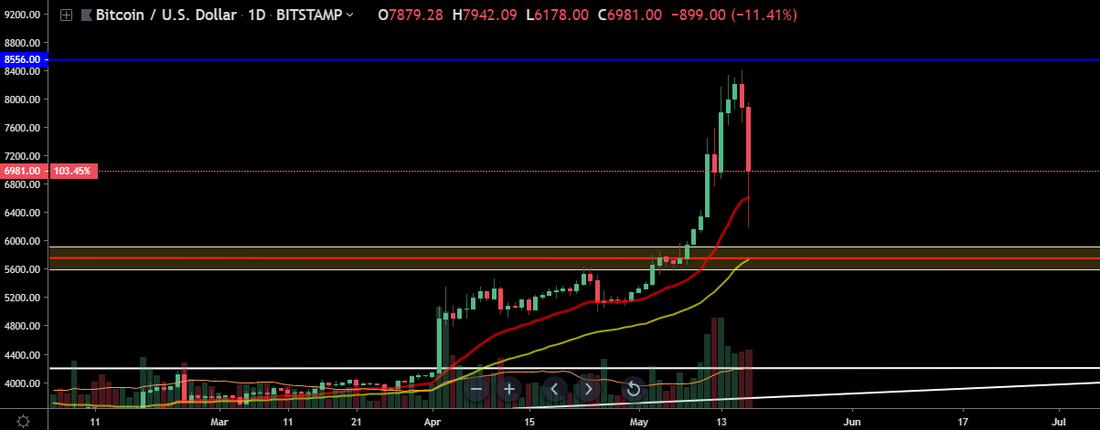 El precio de Bitcoin en el marco temporal de un dia realizó un patron de velas conocido como "envolvente bajista" al acercarse a la zona de resistencia en $8.556 dando como resultado la ignición de un movimiento correctivo hacia promedio movil exponencial de 20 periodos diario ubicado en $6.610, el cual fue perforado a causa de que el precio tuvo un contra ataque de parte de la demanda, dejando una cola de piso cuyo minimo se encuentra en $6.178. Si las velas diarias llegan a cerrar por debajo del promedio movil exponencial de 20, el siguiente target seran los $5.731, zona en la que convergen el soporte de la base del triangulo descendente y el promedio movil exponencial de 50 periodos.