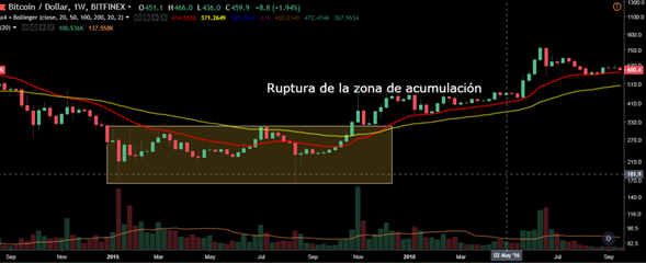 Ruptura de la zona de acumulación del mercado bajista de 2014 - 2015, Cruce alcista entre promedios moviles de 20 y 50 periodos y retrocesos al promedio de 20 (Oportunidad de inversion) Grafico Semanal.