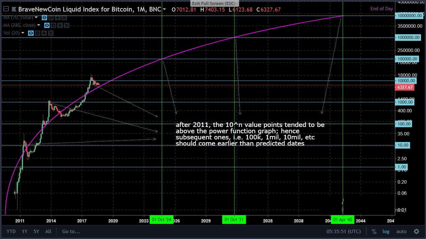 幂函数推测比特币价格走势mynlm (25)in #bitcoin • 8 years ago 原来的幂函数已不适用,在图上直接画更靠谱。2011年之后的10倍数价格皆发生在曲线右上方,虽然峰之间的周期在加长,但曲线升势趋缓,估计接下来的10倍数价格估计也会出现在曲线右上方。 #price #predication