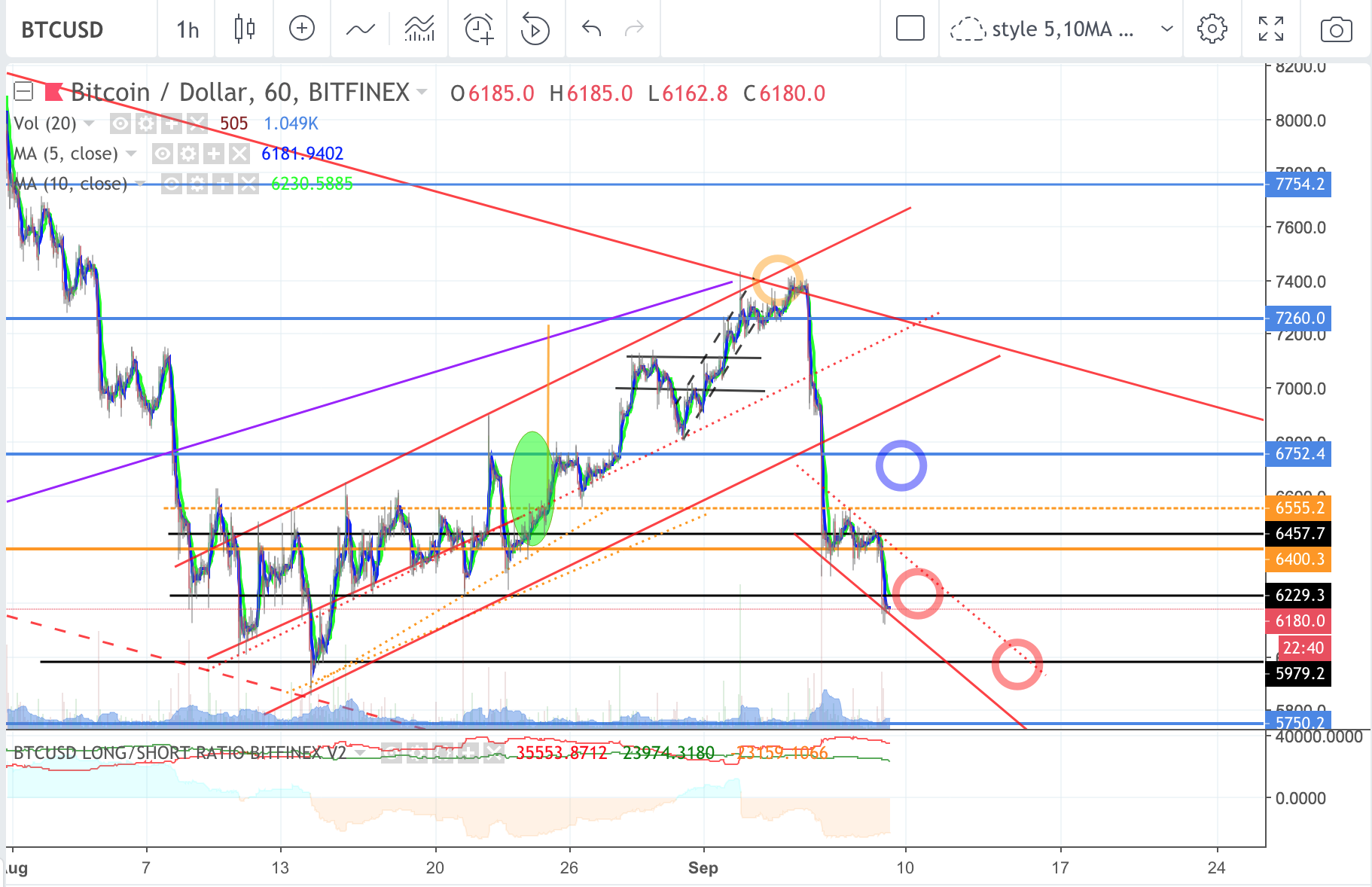 3rd leg of the staircase pattern down. On hourly chart, possible IHS for yesterday dip forming the head or just the left shoulder if the pattern repeat 3 weeks ago. Possible small bearish channel, possible for short bounce to channel top around 6400~6500 zone which intersect with resistance level follow by consolidation.