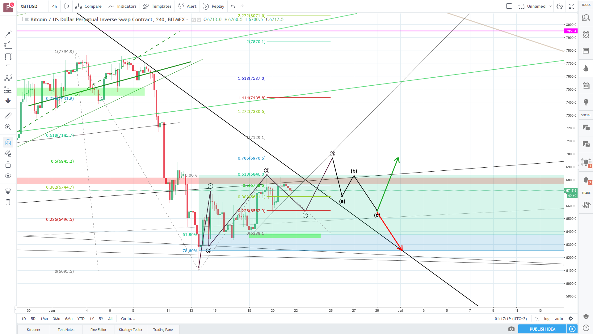 an idea of possible eliot wave movements! wave 3 can be longer. it can dip before it gets longer, but not under green zone. black downtrendline as main resistance.