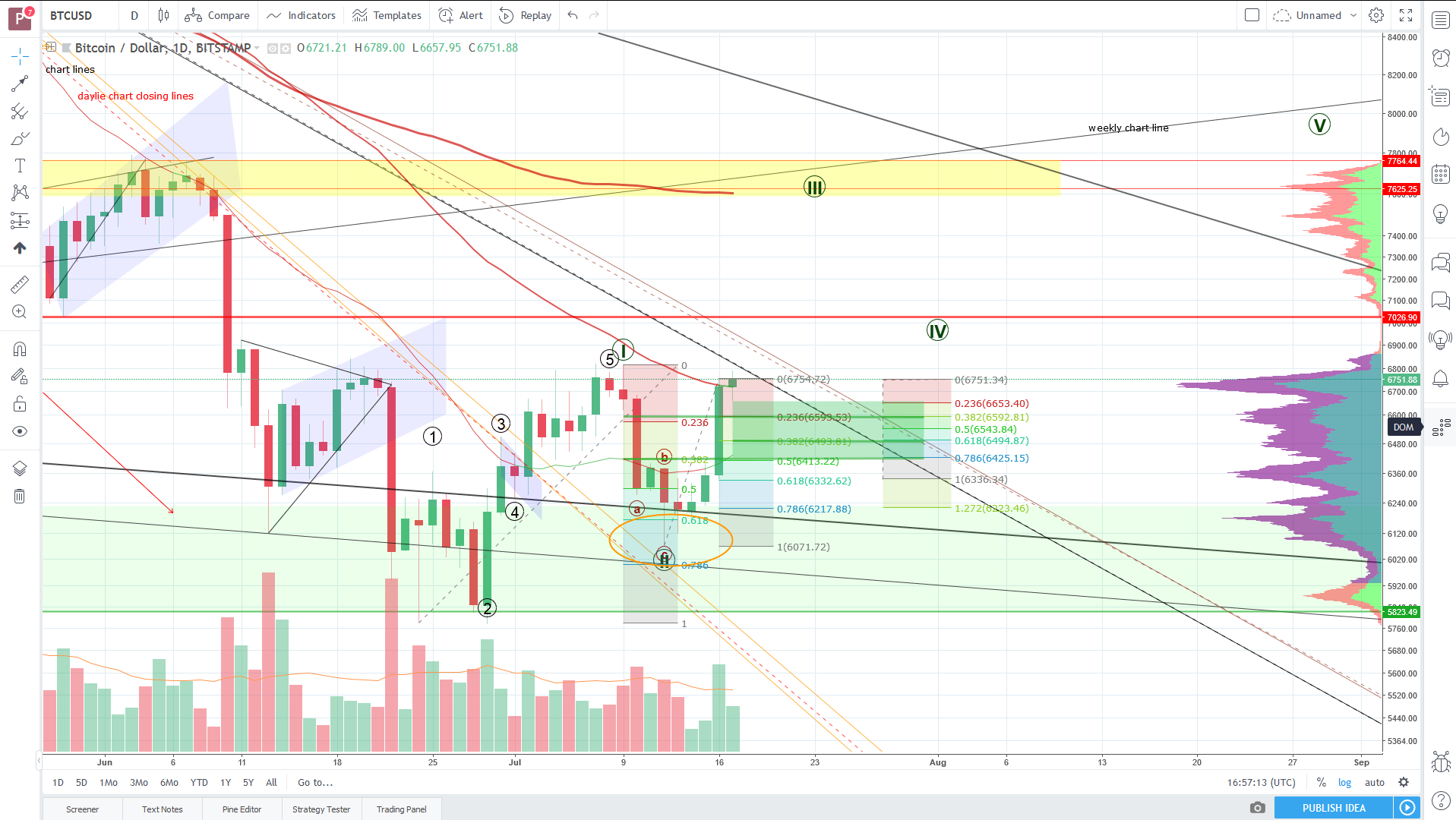 in case u missed it, the retracement finished. BTC established a come back close to the 6800 region. volume profile gap above, and the target for the reverse head and shoulders could mean a strong move up as soon as we establised to break the resistance if there was not the trendlinie we also have to break through. if we establish to break both even though the low timeframe rsi levels are pretty much extended, the better. As BTC has shown in the uptrend 2017 and before, a beginning bullrun starts with overextended rsi levels. if the bulls need some more breath we can see a retracement to the marked fibonacci wave extension levels and hopefully not bellow. If u take a close look at the waves we can see that wave III has started and as wave III in general is the longest, we have even more evidence for a strong bullmove and overextended RSI levels, before the wave IV retracement starts.
