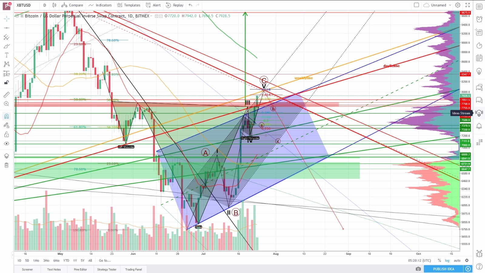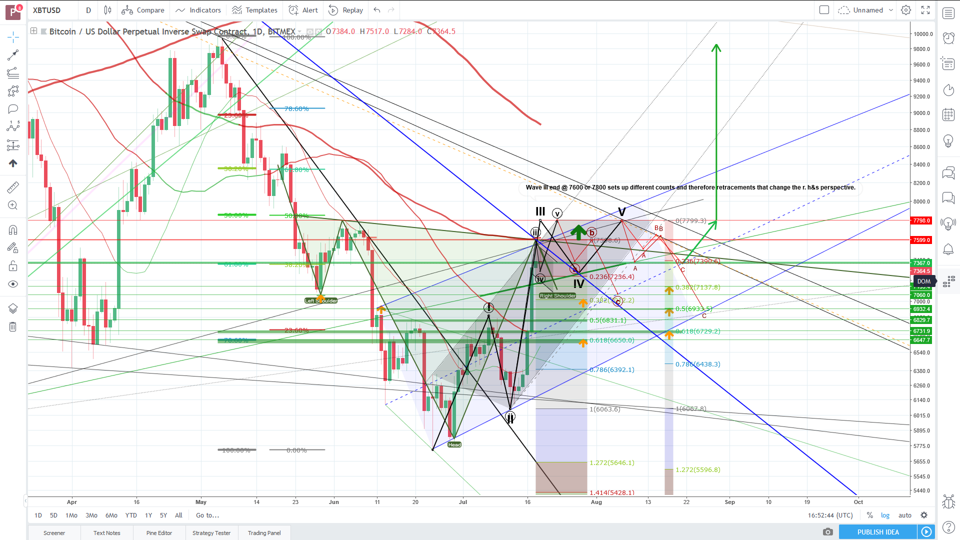 Again high reverse head & shoulder potential. 1st case, early breakout above 100MA daylie and parallel channel painted form the ATH (2nd screen) and over 7800$ and therefore a longer wave 3 than thought. 2nd scenario sideways movements for some days (wave 4 still ongoing), then a move to 7800$ resistance to finish wave 5 (this is the more likely scenario) and from there a ABC correction down, that again gives long entry possibilities because it still would give a plain reverse head&shoulders.