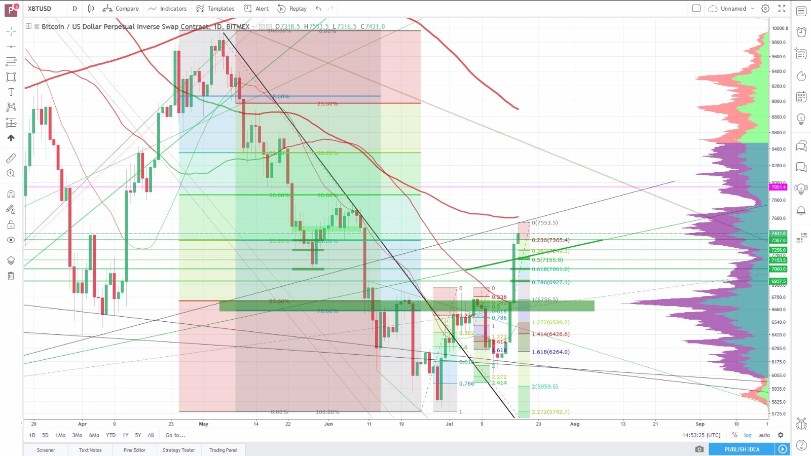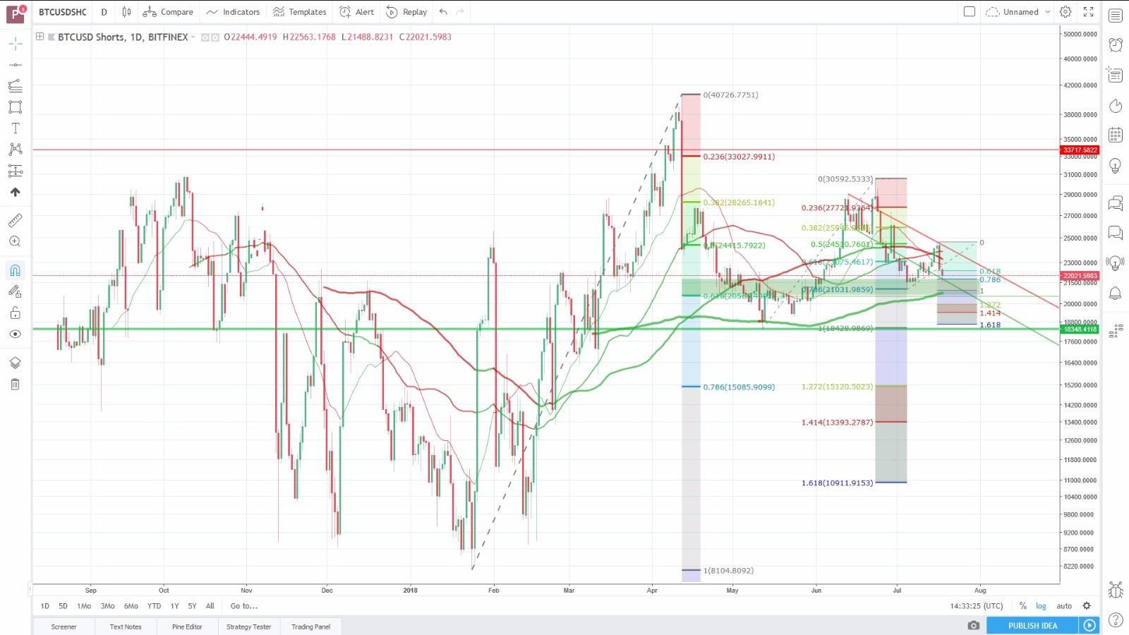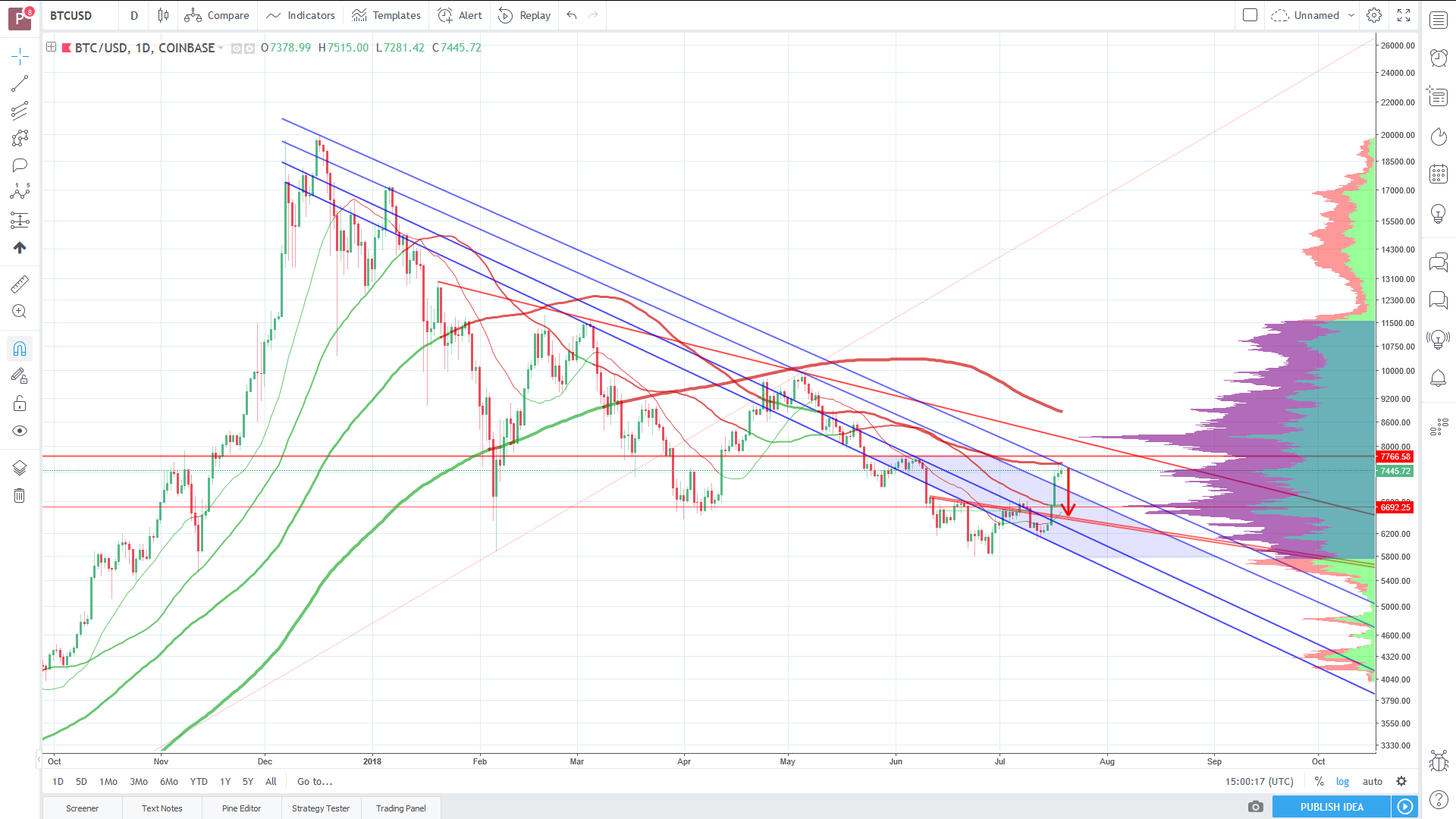 Entry levels für the potential downleg are shown below (outdated becauce BTC took slight move to 7600, look fiblevels in above screen for entry levels).
