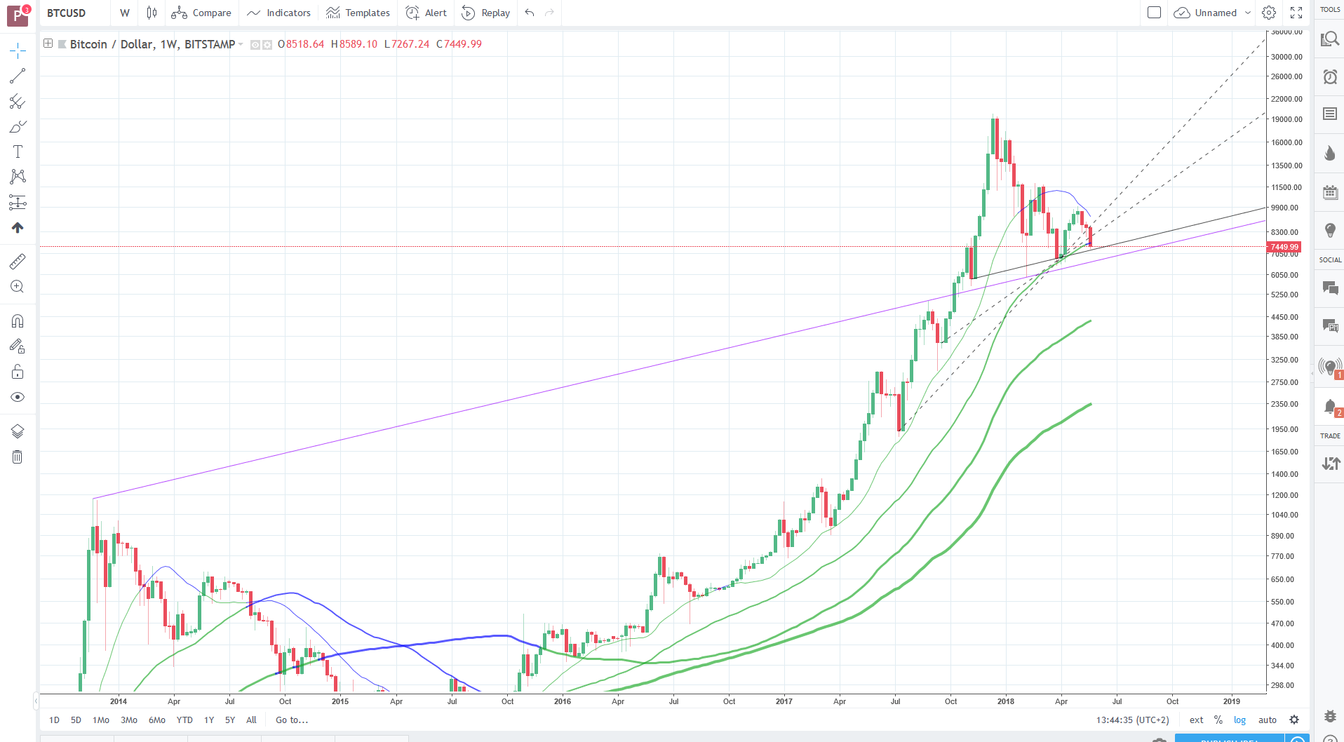 this chart is a new approach for indentifying supportpotential on the weekly chart. black line @weekly closing prices. violet line @weekly candle wicks. for this chart to be valid we need a bounce from the violet line or just a close above the black line.