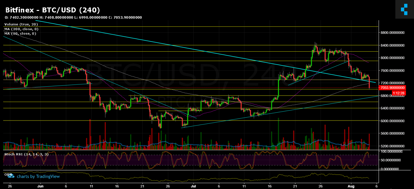 As reported in our last price analysis just four days ago, the two major support levels at $7600 and $7300 had broken down. Now Bitcoin is facing the next major support level at $7000. Keeping in mind that this current candle is very significant – the Moving Average 200 days lies at around $7150. Closing above can lead a correction move.