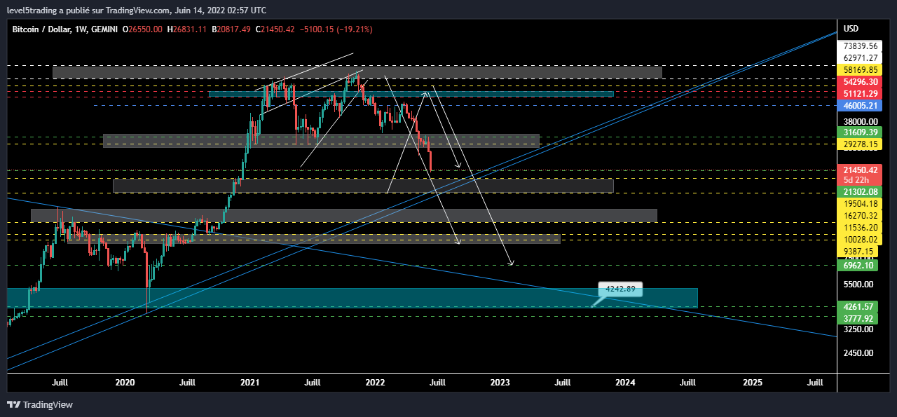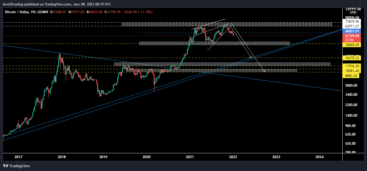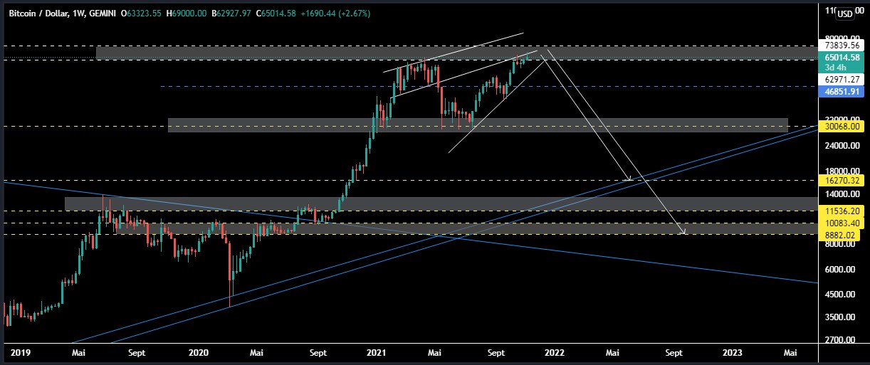 👇👇👇👇هذا ماسبق نشره وتوقعنا لمسار البتكوين بتاريخ 11 نونبر 2021 حاليا انتظار فرصة جيدة للشراء الارتدادي لكن بعد نهاية الموجة الحالية واقتناص آخر قاع عند منطقة التجميع والتي ستأخذ وقت خصوصا ان الهبوط كان من مستوايات 69/65 الف دولار وصولا الى 25/29 الف دولار , ستكون مناطق 16500/19000/21500 افضل مناطق الشراء باذن الله ...