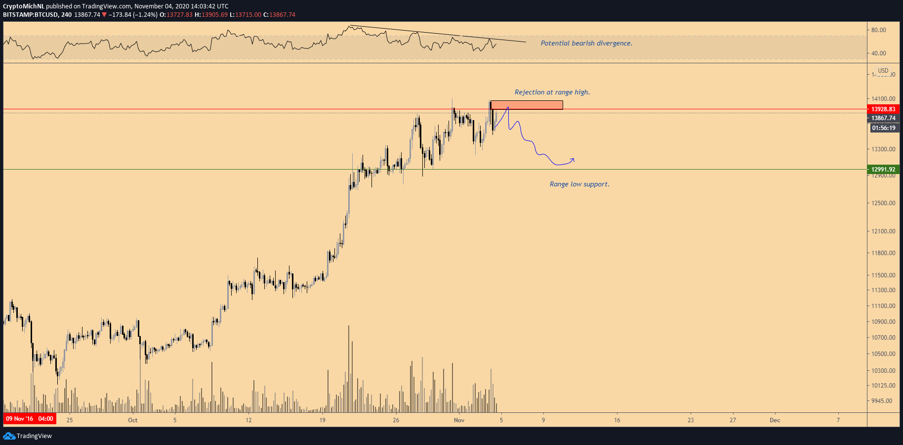However, the 4-hour chart is showing the possibility of a bearish divergence to emerge on the charts. Bitcoin’s price has frequently been pushing toward the $14,000 barrier, just taking liquidity above the high.