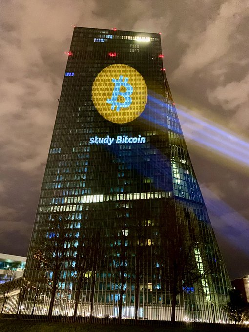 A giant study bitcoin logo plastered on the European Central Bank building...