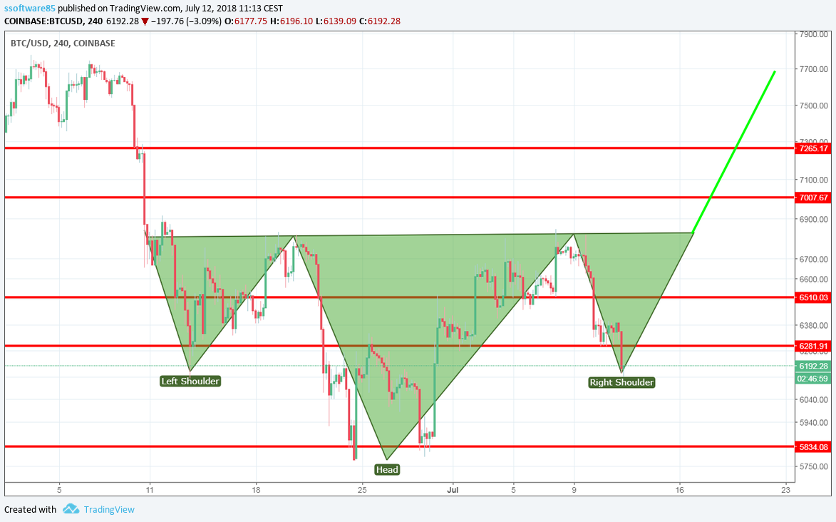 BTC now trading around 6200. Not much to explain here. Inverted head and shoulders formation is clear. It can be broken, if that happen it is back to 5800 and bounce from there. It is more likely that we finish this head and shoulders formation though. After this formation we will see a run up and probably break the 7000 resistance.