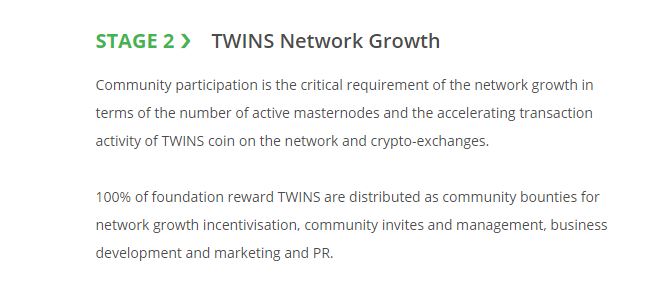 इस परियोजना के चरण 2 के लिए मुख्य लक्ष्य नेटवर्क विकास और आगे विकेंद्रीकरण, सामुदायिक विकास, सगाई और सक्रिय भागीदारी, परियोजना दृश्यता, संचार और पीआर, TWINS सिक्का स्वीकृति और प्रयोज्य, रणनीतिक साझेदारी का विकास है।