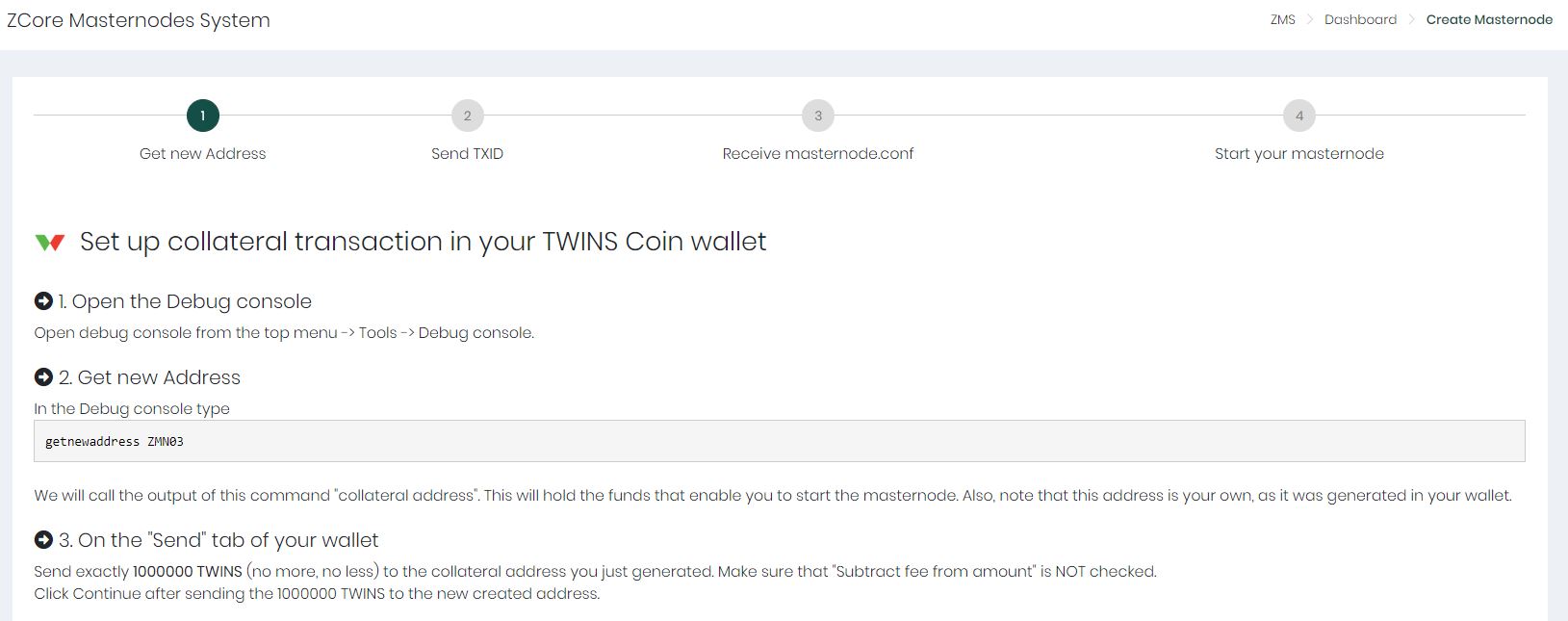 अगले चरण में यह आपको आपके पहले बनाए गए एमएन पते पर 1MN TWINS भेजने और फॉर्म में txid इनपुट करने के लिए कहेगा।