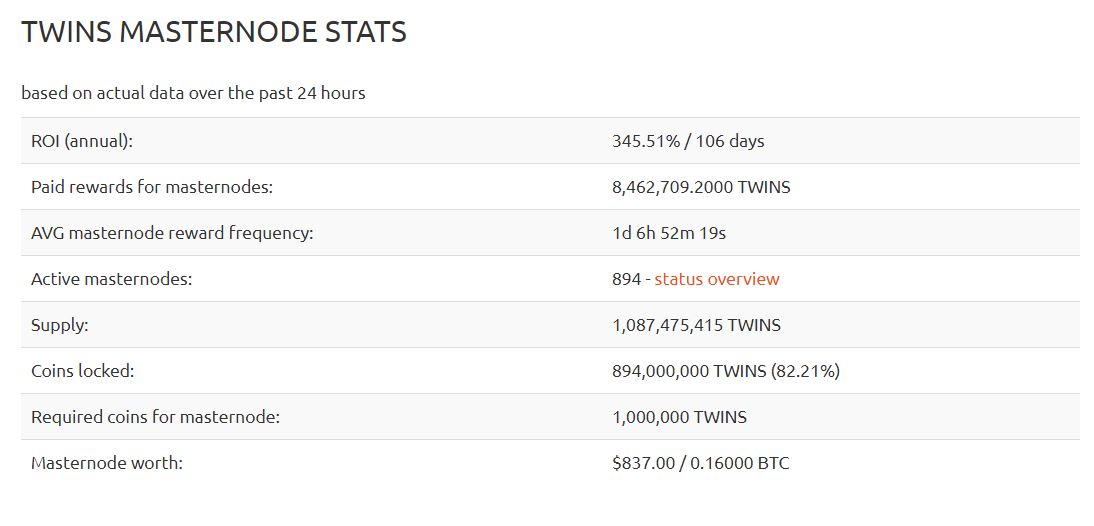 जैसा कि ऊपर से स्पष्ट है, ब्लॉक पुरस्कारों का 80% TWINS मास्टर्नोड्स को वितरित किया जाता है, ब्लॉक पुरस्कारों का 10% TWINS स्टाकर्स को वितरित किया जाता है, और शेष 10% ब्लॉक पुरस्कार TWINS डेवलपर फंड में वितरित किए जाते हैं।