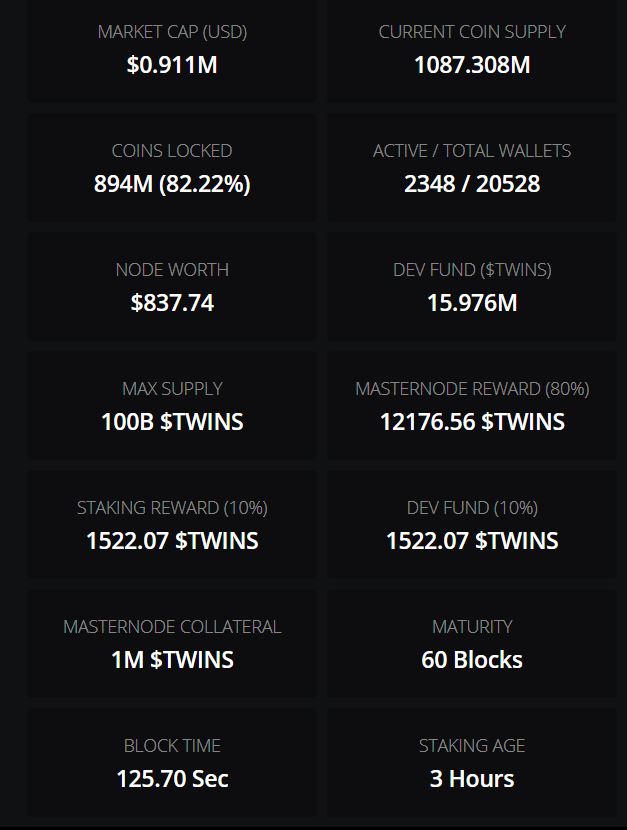 TWINS स्टेक और मास्टर्नोड सिक्के का एक प्रमाण है, इसका सिक्का अर्थशास्त्र नीचे स्क्रीनशॉट में पाया जा सकता है-