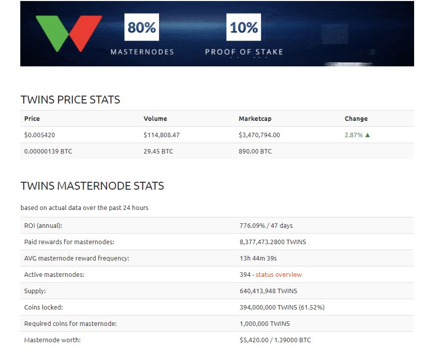 At the time of writing TWINS Masternode RoI is 800% which is one of the best in the crypto space.