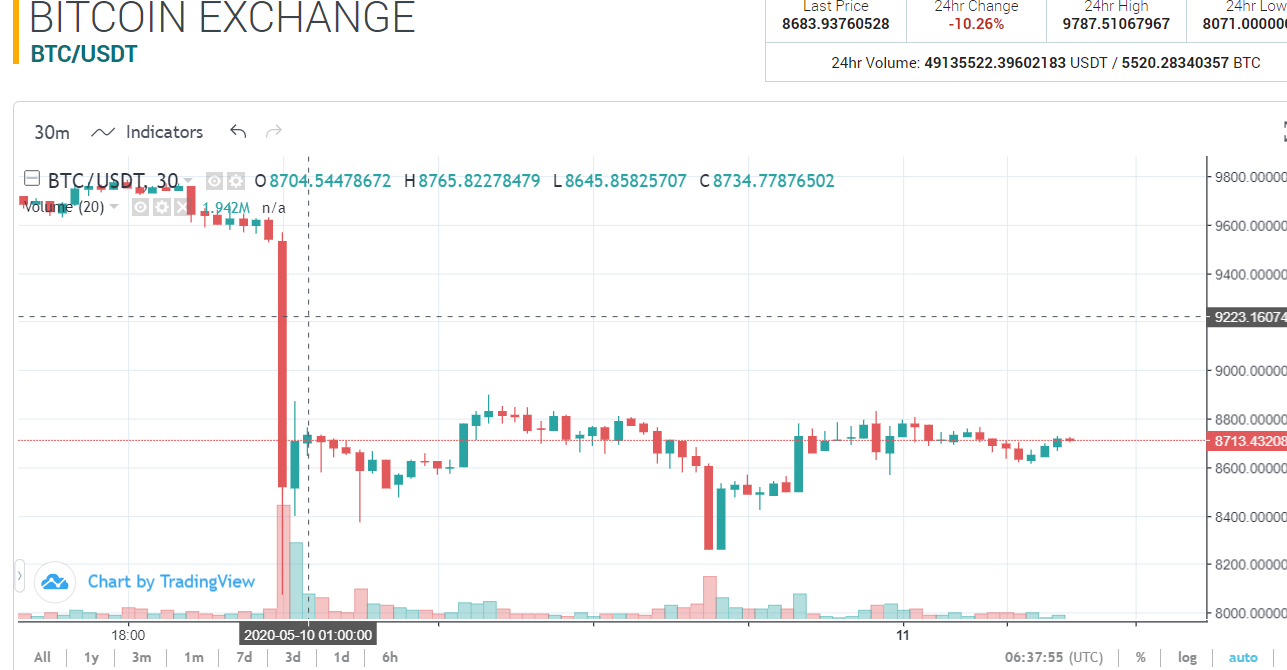 Currently the market looks unimpressed. BTC is currently trading at 8683.93760528 in USDT