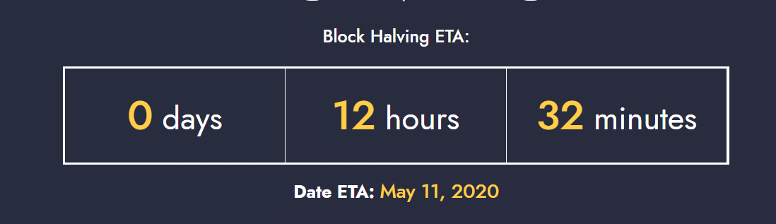 We are approximately 12 hours away from the Bitcoin Halvening. Here is a site for the countdown.