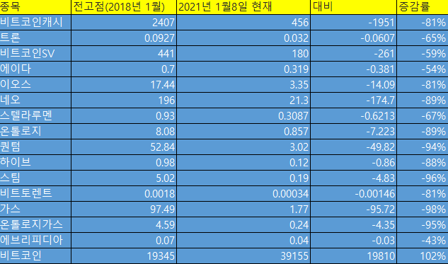 가장 핫했던 2018년 1월 가격 또는 전고점 가격으로 비교해봤습니다.