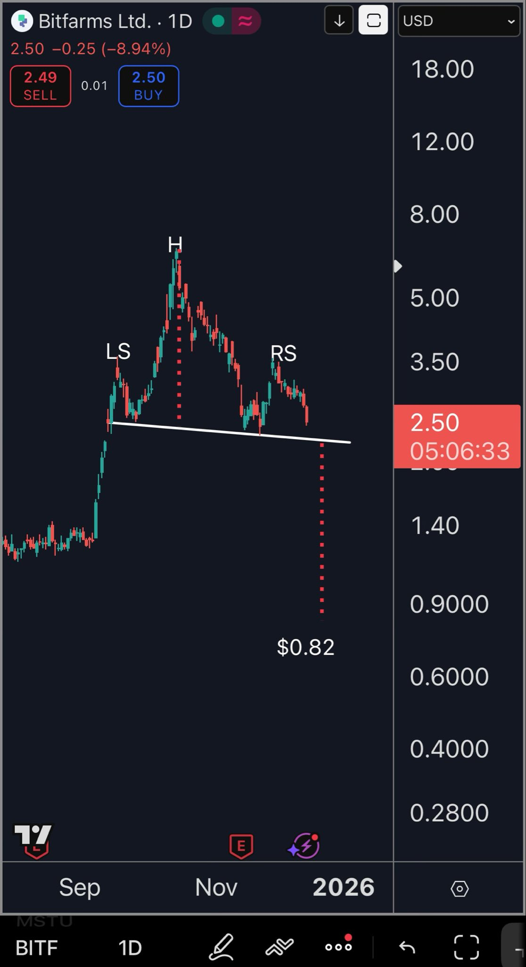 BITFhaejin (89)in #bitf • 4 months ago Hello Management, @Bitfarms_io The chart below shows a Head & Shoulder pattern. If price goes below the white line, #BItF has probable downside target of $0.82