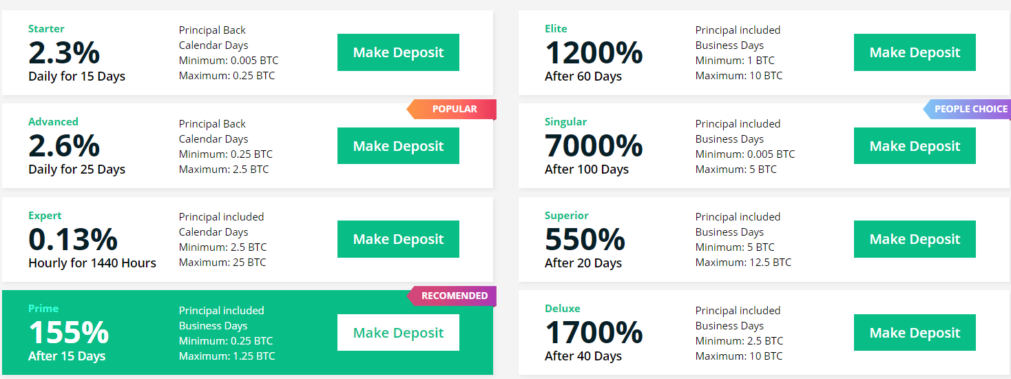 Third, here you are not offered to invest a lot of money, as I already wrote in one of the posts — it is enough to start/try with 0.005 BTC, which is not such a large amount and at the same time get 2.3% daily from the duration of 15 days.