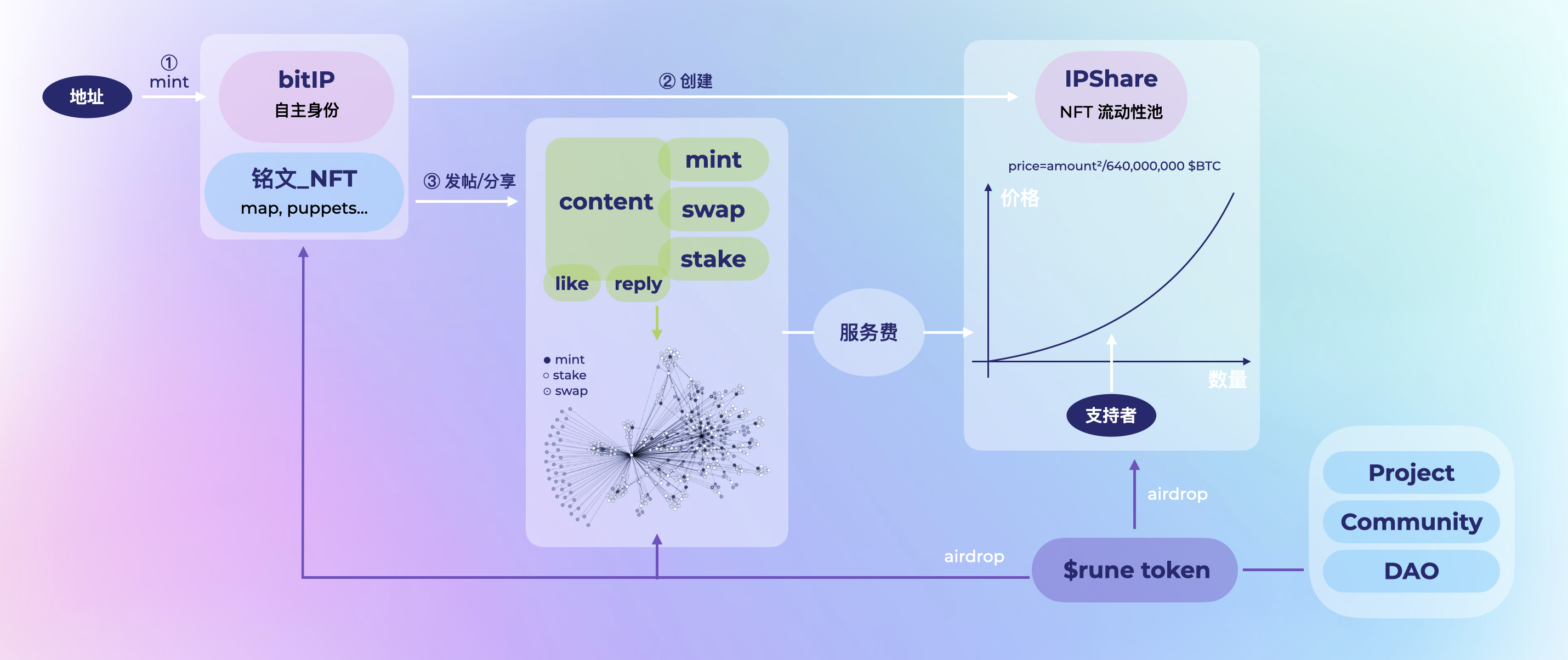我们希望建立一个 bitIP 相互连接的网络,bitIP 之间建立连接的方式是 mint、swap、stake 等,平台收取的服务费则用于奖励连接的建立。