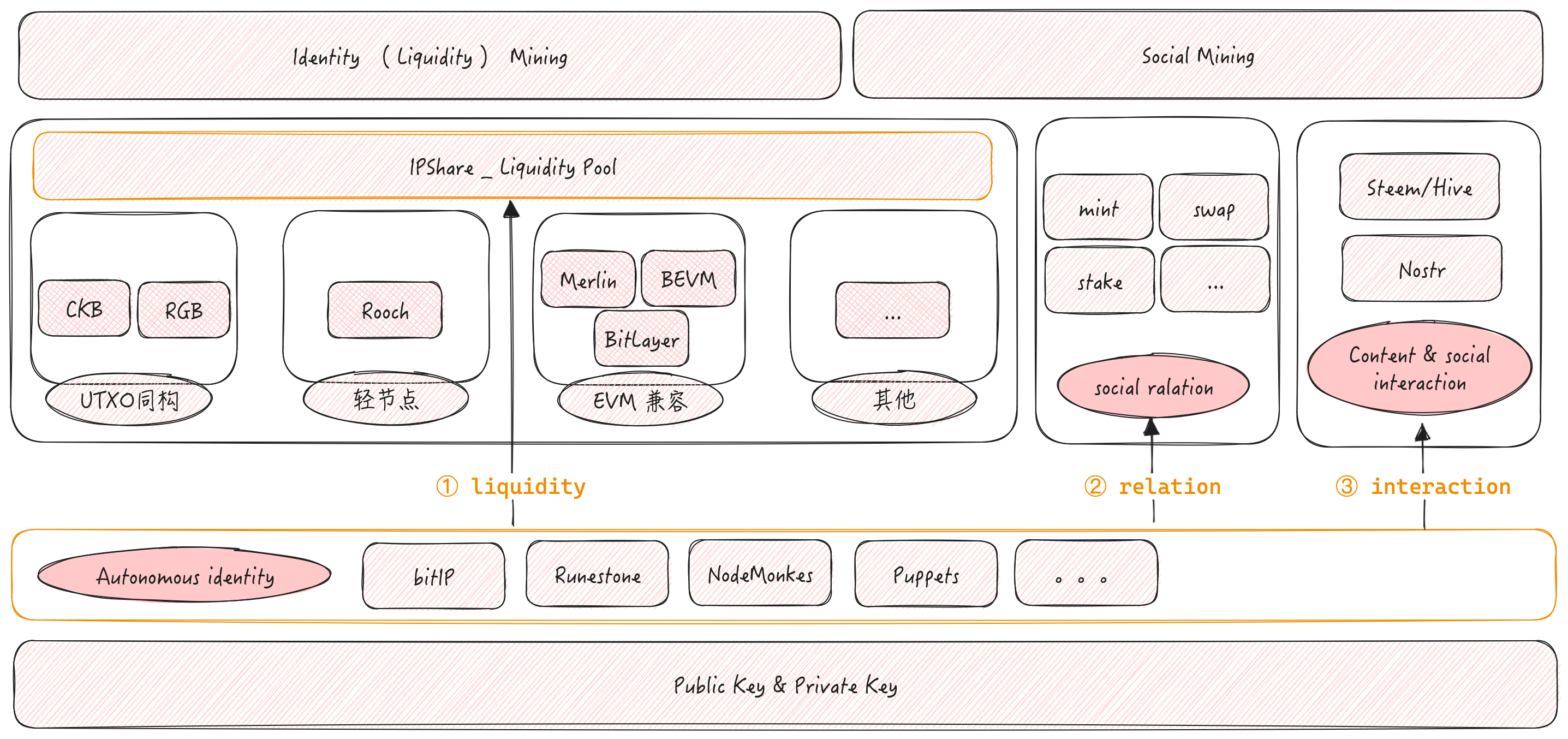 如果我们引入同样支持公私钥体系的 Nostr、Steem 等社交与内容协议,那么我们可以在 bitIP 网络之上围绕内容构建不同的社区 ③。