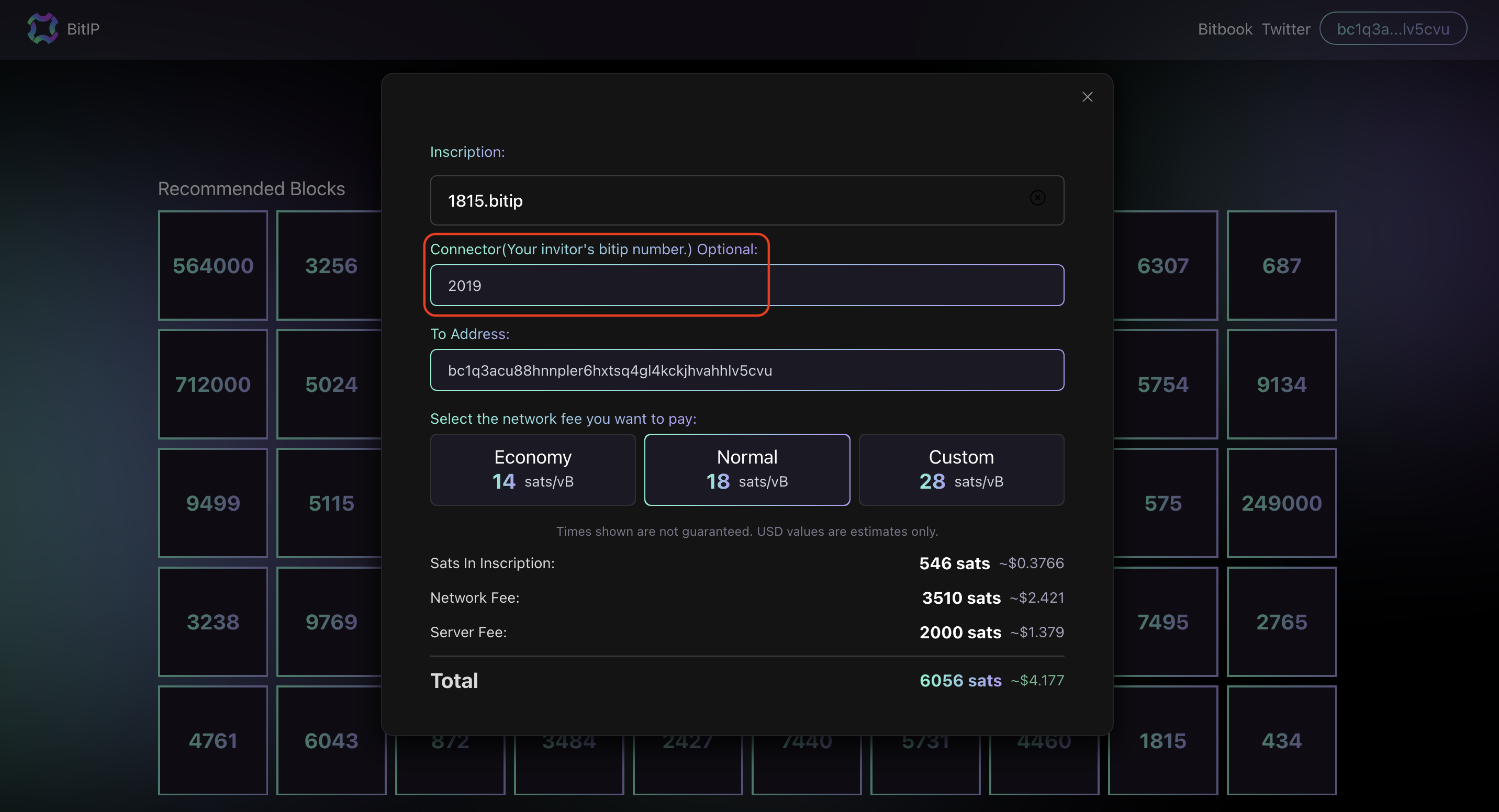 人们在铸造 bitIP 时,可以选择与某个已有 bitIP 建立连接。如图,铸造 bitIP 并与 2019.bitIP 建立连接。