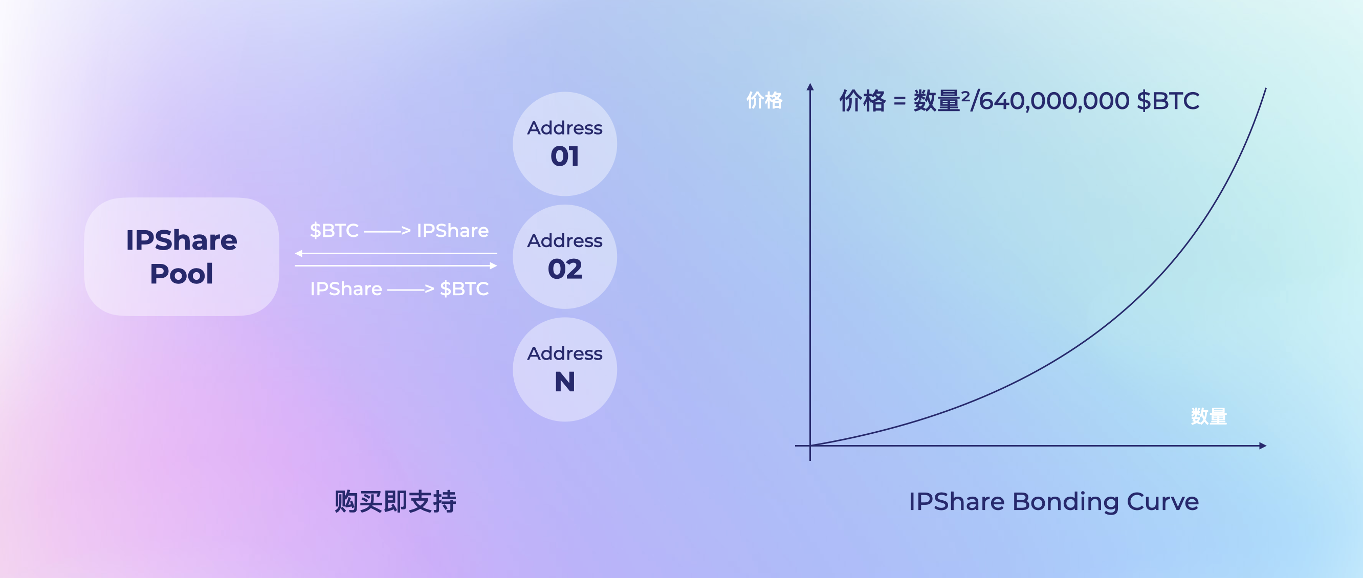 任何地址可以按照 bonding curve 的价格曲线,购买获得 bitIP 对应的 IPShare,对 bitIP 进行支持。越多地址购买某 bitIP 的 IPShare ,其 IPShare 价格越高,bitIP 的去中心化信用也越高。
